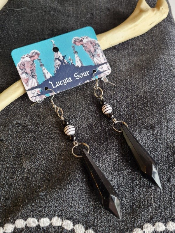 Aros con cristales facetado de acrilico negro, los anzuelos son de acero quirurgico hipoalergenicos. Vienen con trabita de goma
