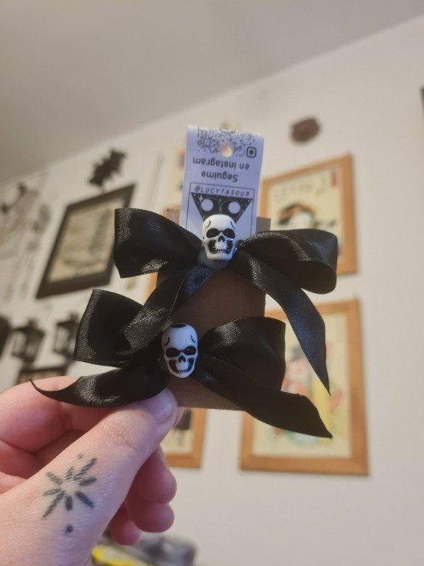 Hebillas con moños de razo y dije. Hebillas tipo cocodrilo.