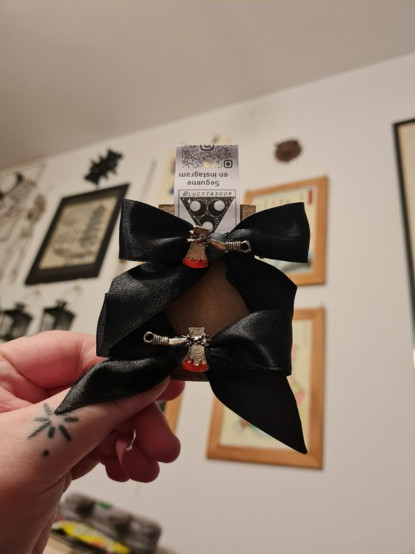 Hebillas con moños de razo y dije metalico. Hebillas tipo cocodrilo.