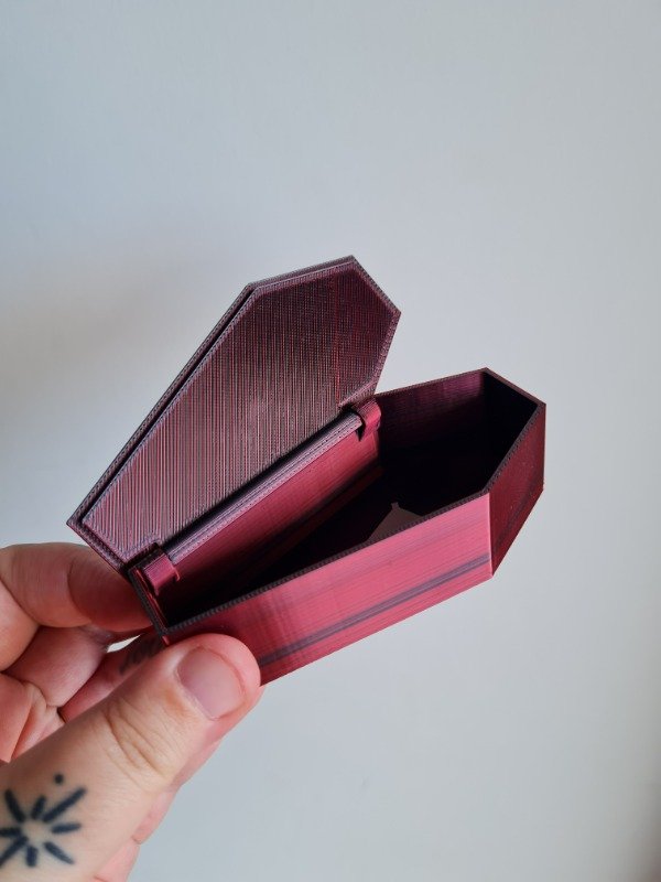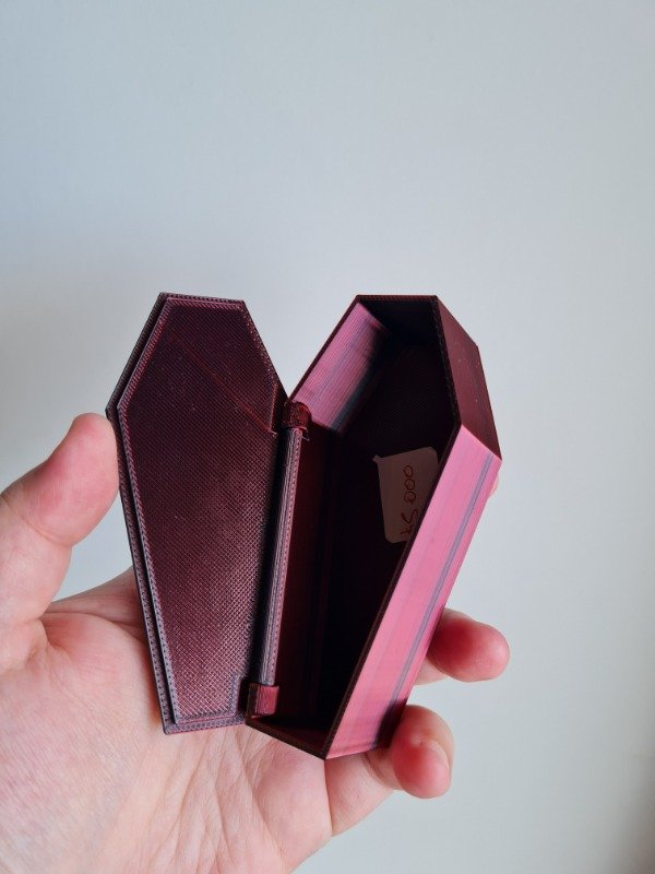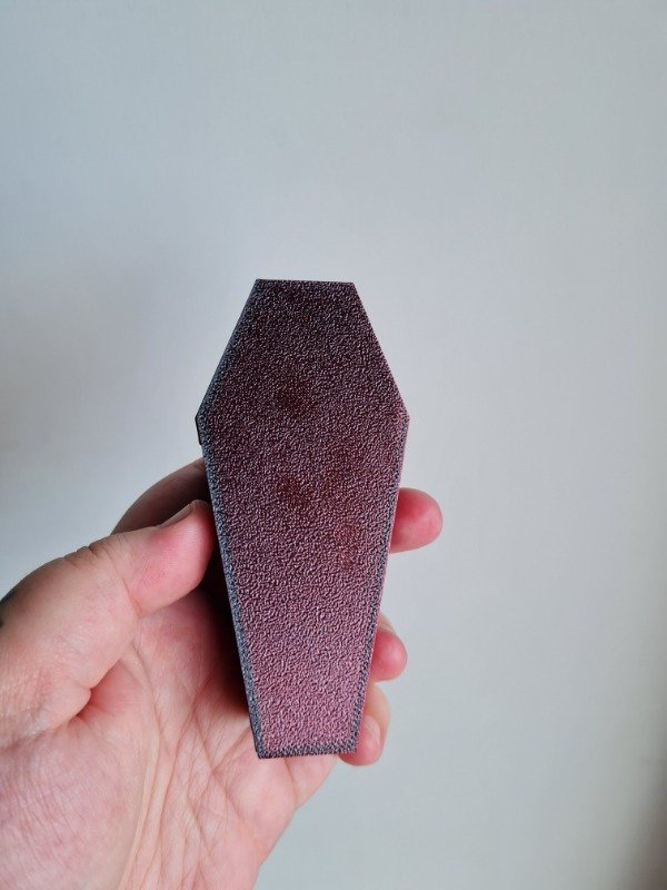 Estas cajitas estan fabricadas en un material duocromatico rojo y negro, los colores pueden cambiar segun el angulo en el que se vea la pieza.