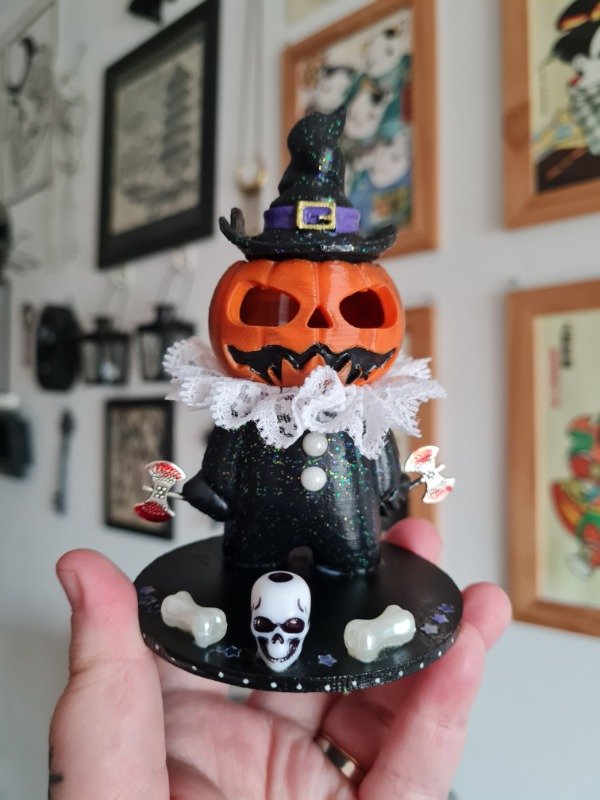 Figura impresa en 3D pintada y barnizada sobre base de madera y detalles en tela.