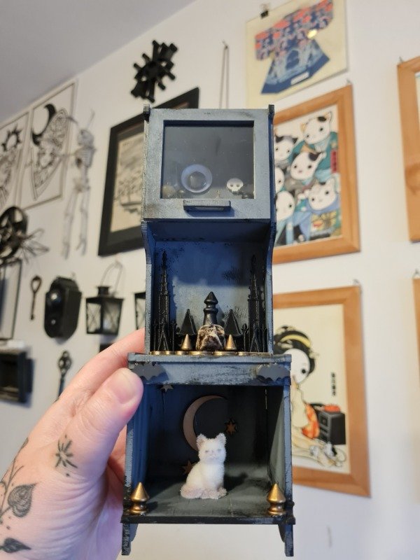 Mini mueble de madera, pintado y barnizado. Los accesorios estan pegado. Todas las puertas se abren y se cierran.