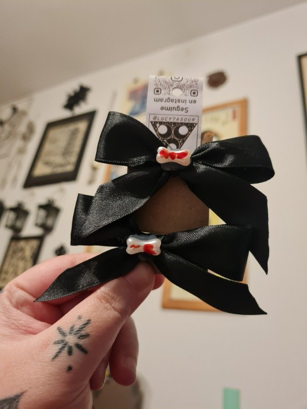 Hebillas con moños de razo y dije. Hebillas tipo cocodrilo.