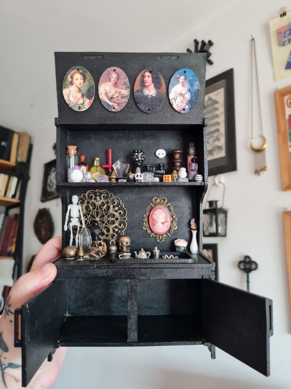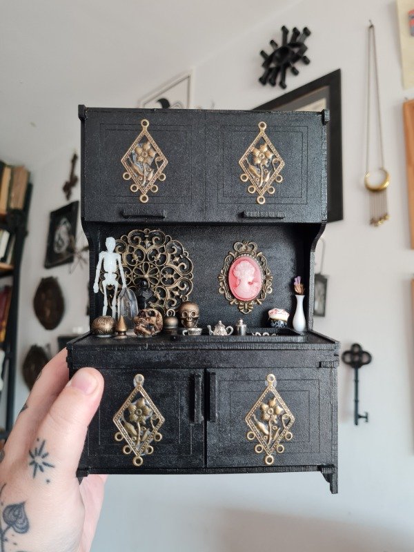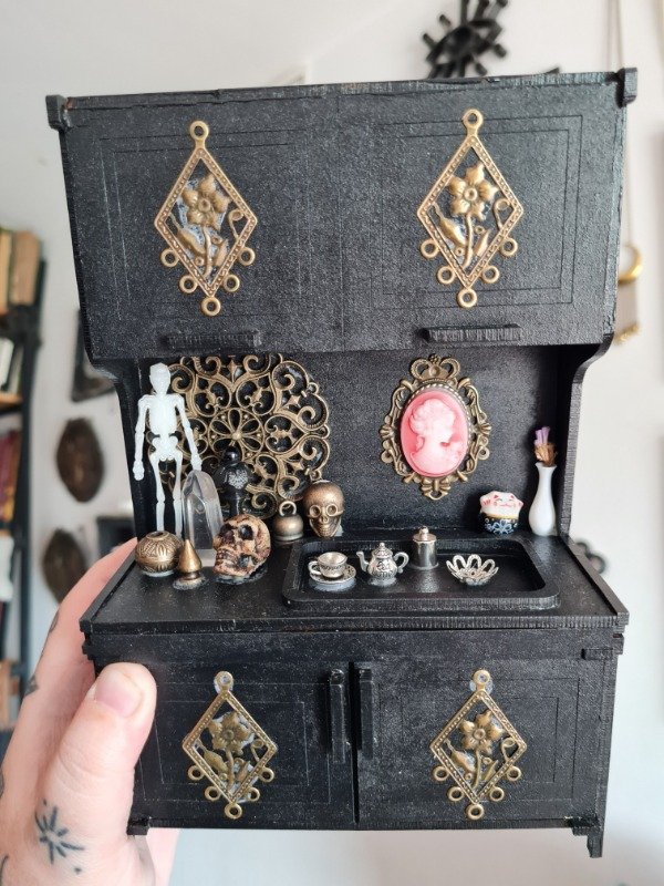 Mini mueble de madera, pintado y barnizado. Los accesorios estan pegado. Todas las puertas se abren y se cierran.